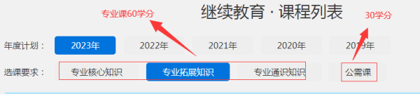 上圖是網校學習的課程安排,目前可以提供的補學。年份是2019 2025 2021 2022 2024年這5年的時間,在學習的過程中我們要先學習專業課,總共60個學時,完成之后進行公需課的學習工學課是30個學時。