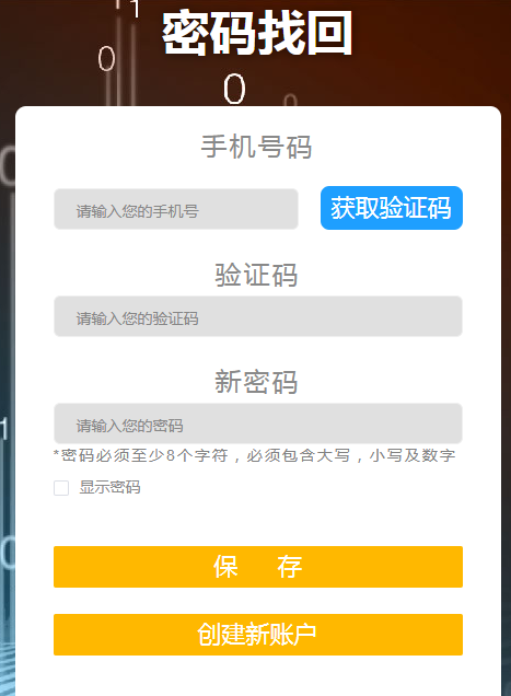 輸入已注冊的手機號,點擊獲取驗證碼并填寫驗證碼,填寫新密碼點擊保存。
