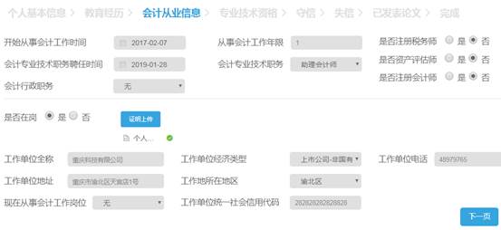 5. 是否在崗:指是否從事工作,包括會計工作和非會計工作,如在崗,需上傳工作證或加蓋單位公章的證明材料的圖片,其中工作證應包括單位名稱、持證人姓名、職位、照片等信息,加蓋單位公章的工作證明模板可參考附件2;如不在崗,請參考第(11)項;